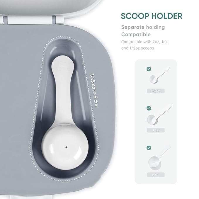 - FORMULA DISPENSING SCOOPS - Our designer specially sized this dispensing scoop 2 ounces, easily make 2oz of milk, this scoop is the same size as most major baby formula brands. The handles easy to grip, it helps you make the baby milk quickly and easily. and our container has a separator layer design to hold the scoop separately. If you have a special sized scoop, don't be worried, we designed this holding area loose enough to compatible with most other different sized scoops.