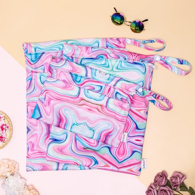 ALVABABY 3pcs Baby Cloth Diaper Wet/Dry Bags|Waterproof Reusable with Two Pockets|Travel, Beach, Pool, Daycare, Soiled Baby Items,Yoga,Gym Bag for Swimsuits or Wet Clothes Pink impression 3L-BS04