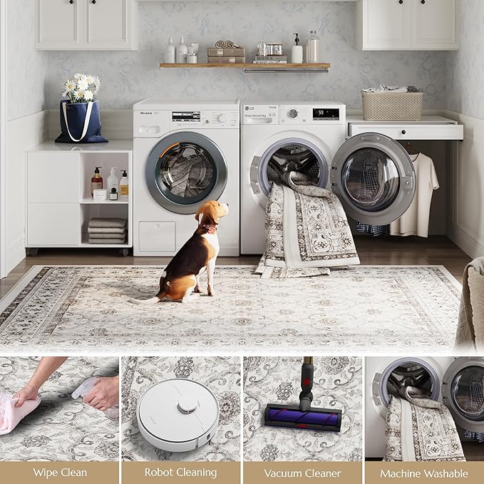 jinchan Floral Runner Rug 2x5 - Machine Washable Beige Vintage Distressed Design Soft Non-Slip Low-Pile Ultra-Thin Runner Rug for Kitchen Hallway Laundry Room Entryway Farmhouse (2‘x5',Beige)