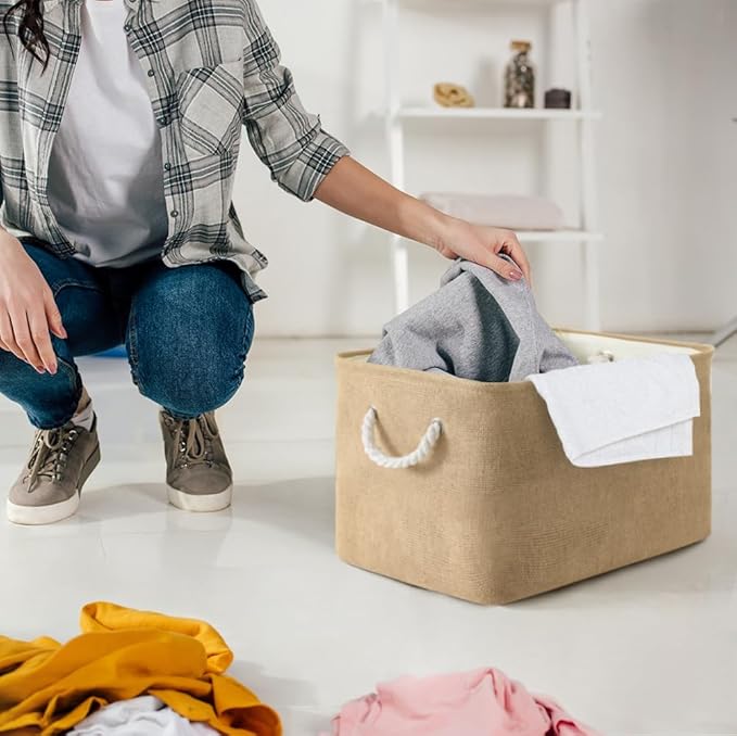 Organization and Storage Basket for Organizing - 17X15X12 inch 2 Pack Collapsible Baskets for Shelves, Fabric Storage Cubes with Rope, Storage Box for Cloth Decorative Gift (Beige)