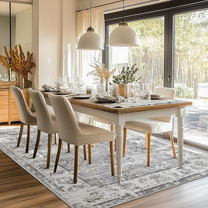 jinchan 9x12 Area Rugs for Living Room - Machine Washable Vintage Floral Distressed Design Stain Resistant Carpet Low Pile Non-Slip Large Rug for Bedroom Dining Room Home Office (9‘x12',Grey)