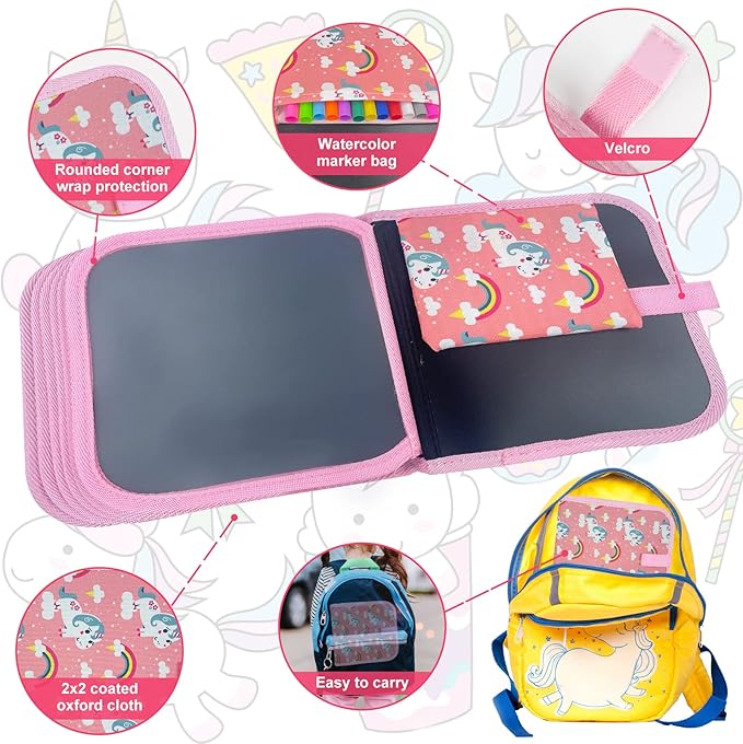 - 🎨Kid's Road Trip Essentials--Kids Erasable Graffiti Book has sticky buttons on the outside to keep it in place and a pens pocket on the inside for 12 watercolor pens. Even in cars, planes and other means of transportation, kids can draw as much as they want.