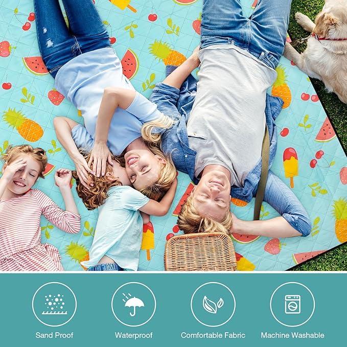 - HIGH QUALITY FABRIC: The top fabric is made of durable polyester, and printed with lovely summer fruits, closer to life and nature, the color printed is safe and fastened, not easy to fade as time goes. The soft cotton padded in the middle, making the picnic blanket soft and comfortable to sit and lie down.