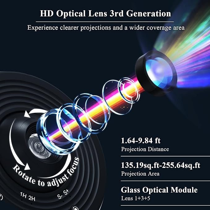 - HD Optical Lens 3rd Generation: Experience clearer projections and a wider coverage area, (1.64-9.84 ft Projection Distance), (135.19sq.ft-255.64sq.ft Projection Area), (Glass Optical Module Lens: 1+3+5), Brightness: up to 20% brighter, Clarity: up to 150% clearer. Elevate your visuals with cutting-edge clarity and expansive coverage. Our advanced optics deliver razor-sharp details and seamless brightness across larger spaces, perfect for kids adults, bedroom and kidsroom. Upgrade to precision—transform your viewing experience today!