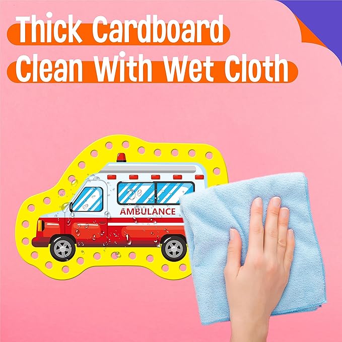 - Bright-colored & Eye-catching: The pattern covers different vehicles, like taxi, school bus, fire truck, police car, ice cream truck, bus, truck and ambulance. The patterns on cards are colorful, big and vibrant. The holes are clearly cut and easy for preschoolers to work with. The strings are easy for children to use and fit into the holes easily.