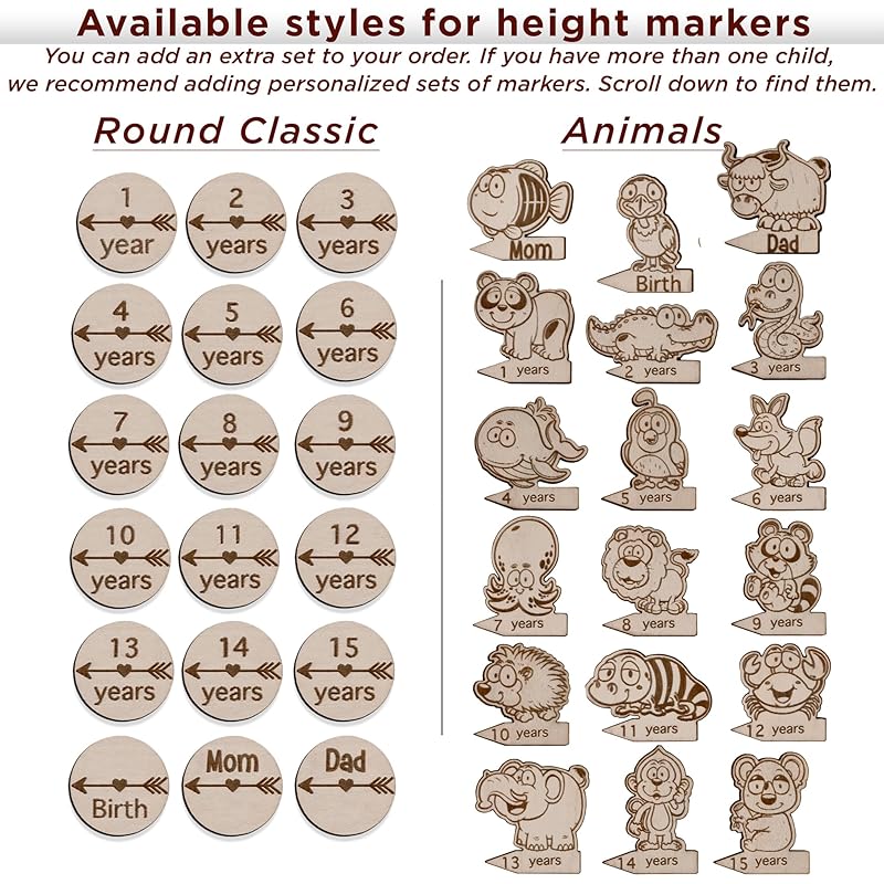 - Set of growth markers: these markers can be attached to a wooden kids' measuring chart using double-sided stickers to serve as growth marks, you can add an extra set to your order by scrolling down the product detail page, additionally, if you order an extra set, it can be engraved with a name, if you have more than one child, we recommend ordering personalized sets for each