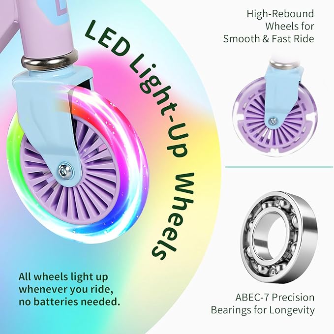 - Super Cool Fun Ride: The kids scooter features LED flashing light up wheels, no batteries needed. Lights get brighter with the faster your kids go. With battery powered LED lights on the stem and deck that can be powered on or off, 7 color changing modes create lighting effects that look like the lights are jumping or cascading or chasing each other. You'll love this special feature, making your scooter unique!