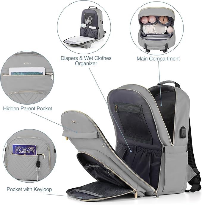 - Convenient and Thoughtful: Baby diaper bag features 15.6’’ padded laptop pocket and 12.9’’ iPad pocket in the main compartment, USB charging port, 2 built-in stroller straps, waterproof pocket, back anti theft pocket, dual zippers for easy access and closure even with one hand! Also we have added a luggage sleeve on the back so it can easily slide over a carryon luggage while on the go.