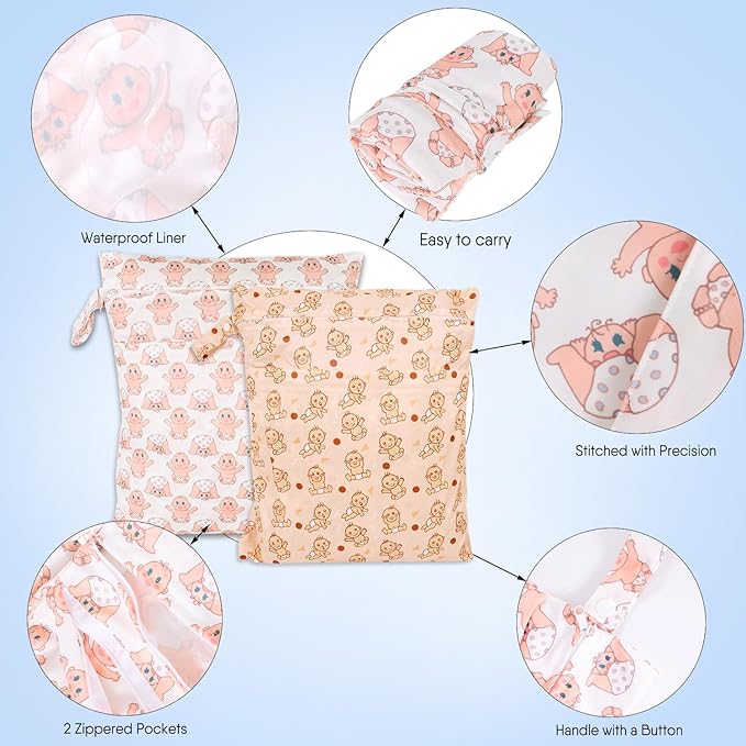 - 2 ZIPPERED POCKETS & HANDLE DESIGN: The 2 pack laundry bags are designed with 2 zippered compartments to keep wet and dry clothes separately, or separate dirty and clean diapers. Keep dry and clean. There's a handle with a button on one side for hanging up, convenient to carry and attach to your stroller, doorknob, towel rack, hook or handbag.