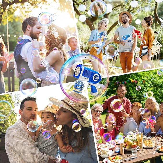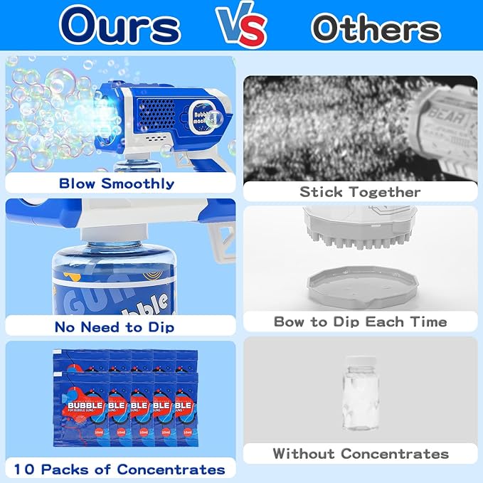 - ❤Abundant Accessories:Bubble machine gun kit includes 2 bubble guns (bule and red), 4 bottles bubble refill solution and 10 Bubble Concentrate.Perfect Bubble Toy and Family Fun and Outdoor Activity Toys.