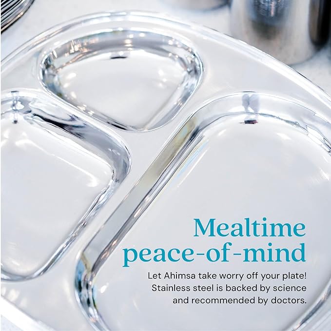 - ๐๐ฎ๐ข๐ฅ๐ญ ๐ญ๐จ ๐๐๐ฌ๐ญ: Parents love the durability of Ahimsa's stainless steel toddler plates, built to handle daily use by active toddlers. This unbreakable design ensures long-term reliability without cracks, chips or stains. Whether you're using it as a toddler plate or one of your go-to kids dinner plates, Ahimsa supports safe, sustainable eating every step of the way