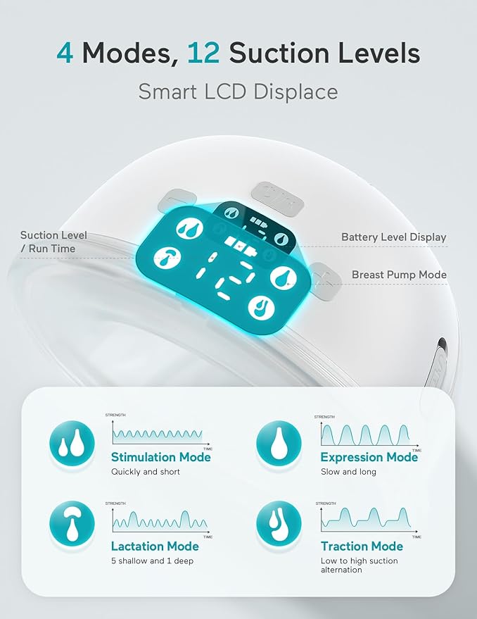 - More Comfortable And Efficient: Paruu P16 breast pump with 4 Modes & 12 Levels, suction range 49.5 - 309mmHg, You can customize your pumping rhythm, suction power and speed make sure every mother can adjust the suction strength based on milk flow and comfort level. Provides a more comfortable and efficient breastfeeding experience.(Tips: When the suction is weakened, please first check whether the Valve and Diaphragm are tightly installed)