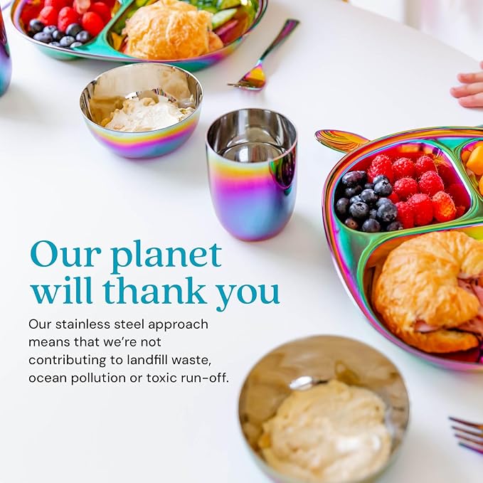 - Created with Parents in Mind โ Our rainbow kids plates and bowls sets are easy to clean, dishwasher safe, stackable, shatterproof, with no risk of peeling. All Ahimsa toddler plates and stainless steel kids dishes are plastic free and free of BPA (and all bisphenols), PVC, phthalates, lead, siloxanes, melamine and formaldehyde, making them a favorite for parents, combining saftety and fun with a rainbow deisgn that promotes healthy, balanced meals.