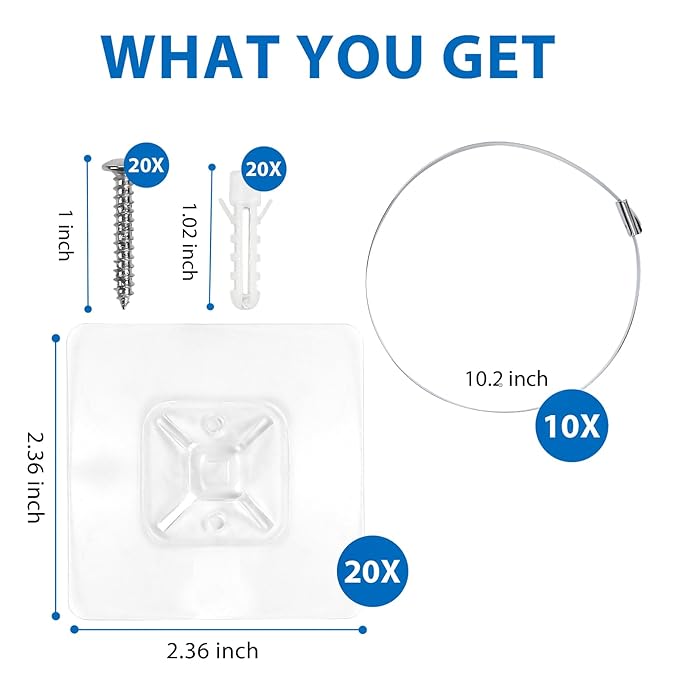 - What You Get - Each package includes 10 pairs of adhesive pads, 10 metal ties, 20 screws/anchors, and detailed user instructions for installing and removing the anchors.