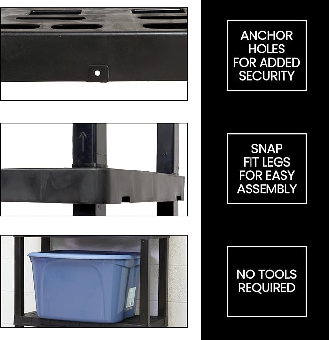 - DURABLE RECYCLED PLASTIC CONSTRUCTION : Built to last, our heavy-duty molded plastic resin shelves will not rust, dent, stain, or peel. Ventilation holes let air flow freely around your belongings, keeping them fresh and dry. This durable construction ensures long-lasting use and reliability, making it suitable for various environments, including damp areas, ensuring your items stay protected.