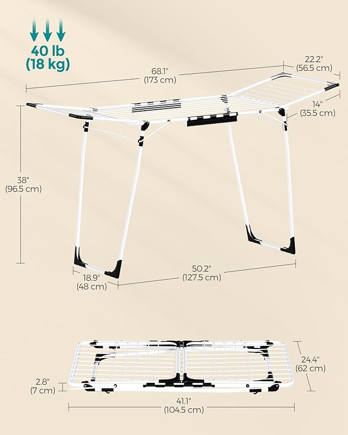 - [Foldable and Rust-Resistant Design] If needed, the clothes drying rack can be folded and stored to save space. The drying rods are finished with a rust-resistant coating providing an extra sense of security when hanging wet clothes