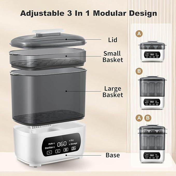 - 【4 in 1 Multi-function】This bottle dryer is designed with a fully automatic operation and LED countdown display, you can steam only, dry only, steam and dry, and 72-hour secure stroage, convenient for busy parents. The small basket and large basket can be freely and flexibly combined to save space and meet your needs.