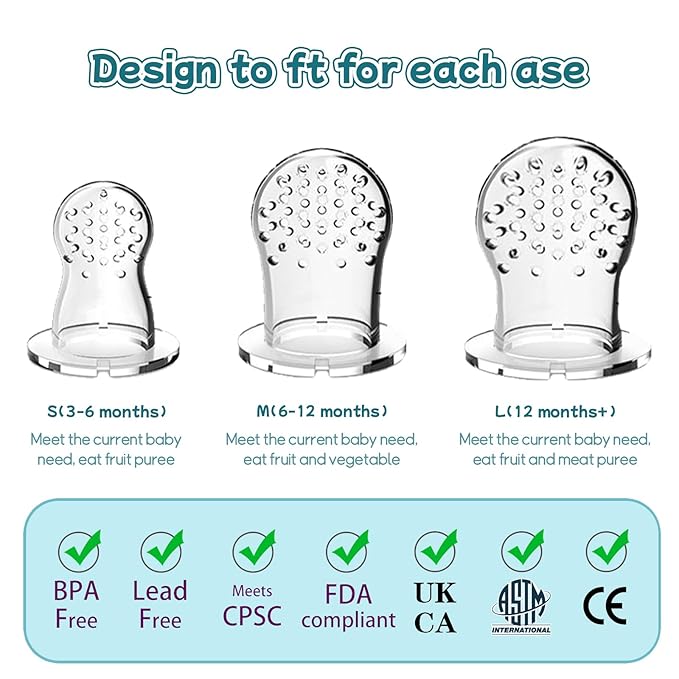 - 【TRY SOLID FOOD FLAVORS】HAOBAOBEI silicone feeder set including 2 pack baby silicone feeder with 4 silicone pouches, which is designed to fit for each age. Just put fresh fruits, food or frozen breastmilk, your baby will enjoy the taste of solid foods by chew the baby feeder.