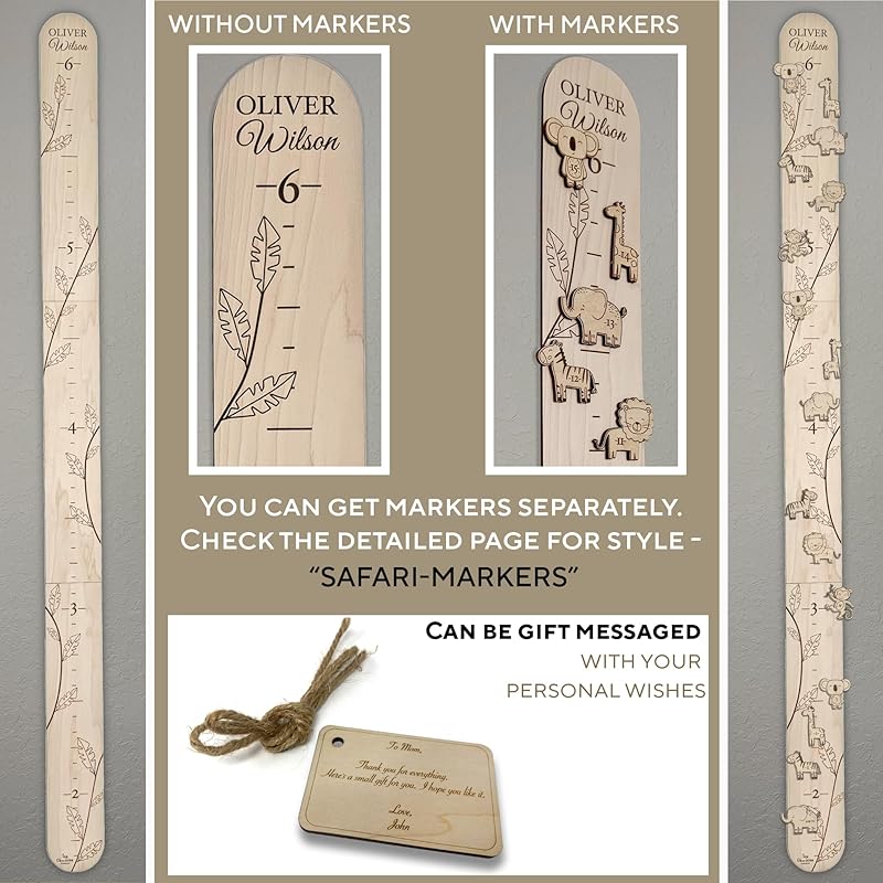 - Customizable: personalize animals growing chart with child's name or a short phrase like "watch me grow". If only one name is provided, it will be engraved in cursive by default (similar to 'Wilson' in the photos), unless other preferences are indicated. Elevate jungle theme kids room with this cute and customizable height chart, creating lasting memories as they measure their growth