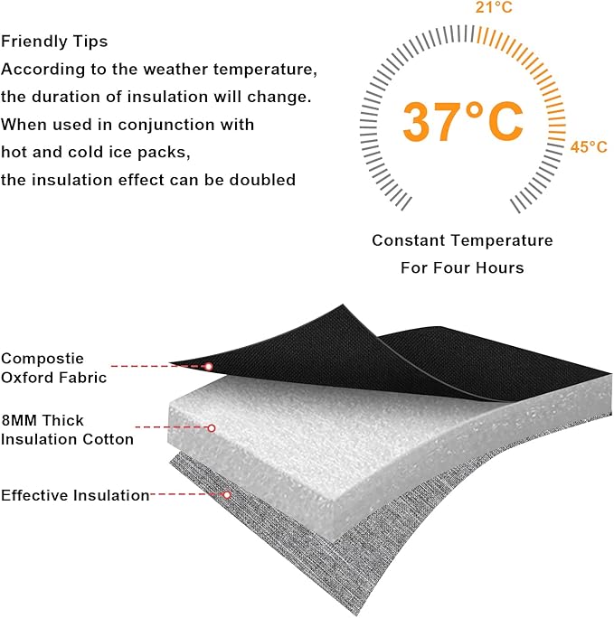 - MATERIALS: Made of water-resistant composite oxford fabric, 8mm extra-thick EPE foam and food-grade aluminum foil liner. Food safe, durable, lightweight. Effectively keep bottles stay cold, warm or fresh for hours, it keeps breast milk fresh.