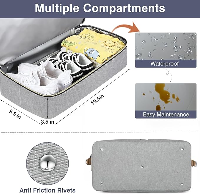 - [Dry Wet Seperated Compartment] The compartment of this travel diaper bag is fashioned with PVC waterproof materials.This compartment can also be used to hold dirty clothes, shoes or wet towels, separating wet and dry to prevent your clean luggage from getting soiled or wet. Compartment size: 19.5*9.5*3.5in. Also studded 4 round metal feet in the bottom to keep the baby diaper bag clean and off the ground.