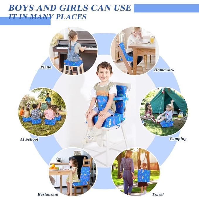 - [Unique Toddler Booster Seat] We added a piece of fabric to the adjustment belt to increase the contact area between the booster cushion and the chair, avoid tearing when pulling the product, and protect your chair more——Original design, Patent No.:US D1,007,902 S