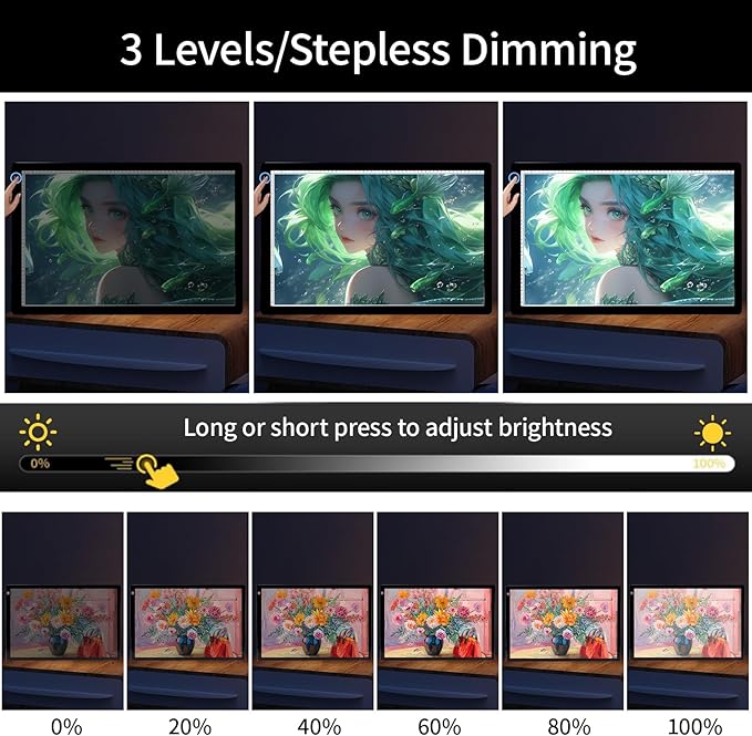 - Dimmable: The light box for tracing has 3 levels of brightness adjustment, with a maximum of 4500 Lux. It can display every detail of the symbols, and numbers that are difficult to see in diamond art.