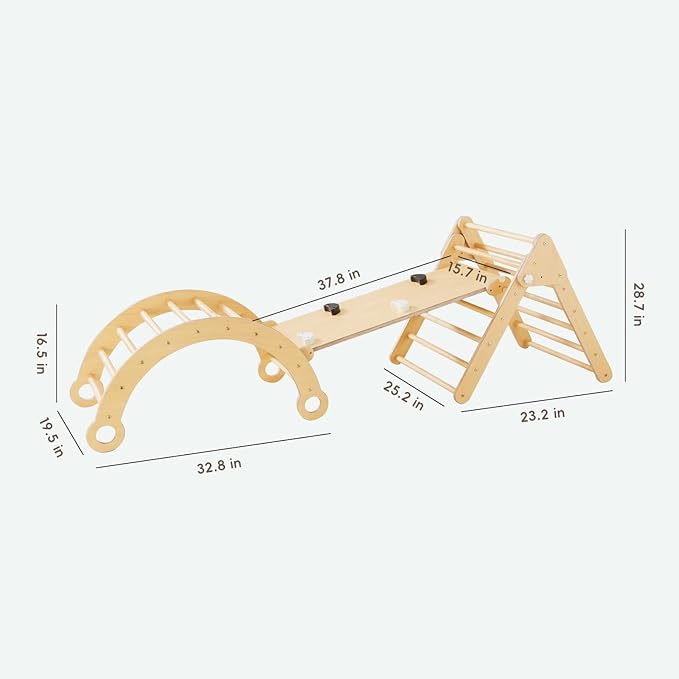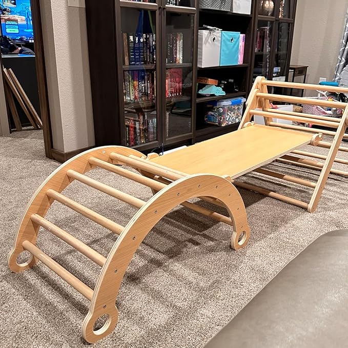- 【MULTIFUNCTIONAL PLAY MODES】Unleash creativity and passion with the indoor multifunctional baby climbing toy! Featuring an arch, pikler triangle and ramps on both sides, your child can create 7 different combinations for endless play possibilities. The thick board has two sides and can be used as a climbing board and a skateboard. You can turn the climbing arch upside down, put a mat (not included) and use it as a big rocker