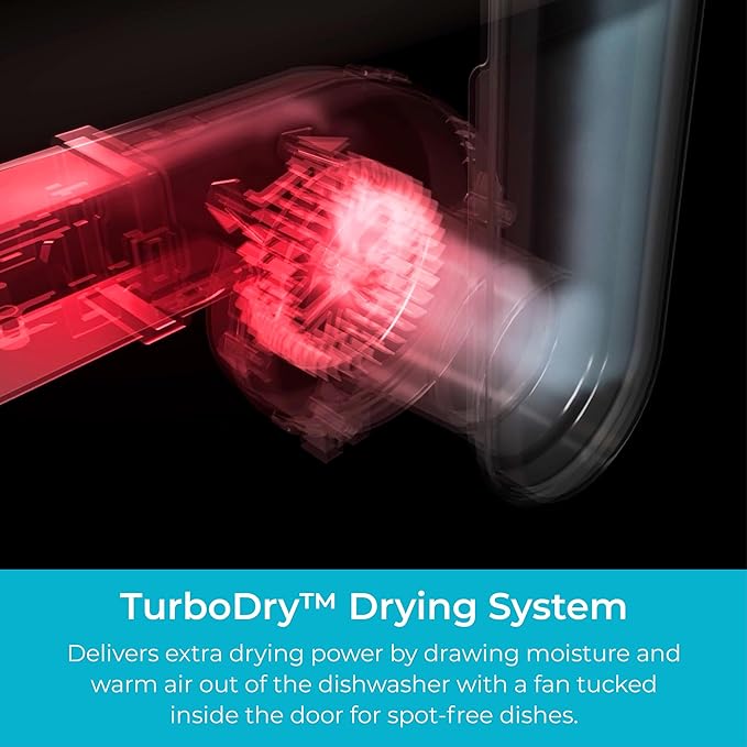 - TurboDry for Dry Dishes: A built-in fan pulls moisture and warm air out of the dishwasher while a heating element boosts drying power. Even plastics come out dry and spot-free. Ditch the dish towel