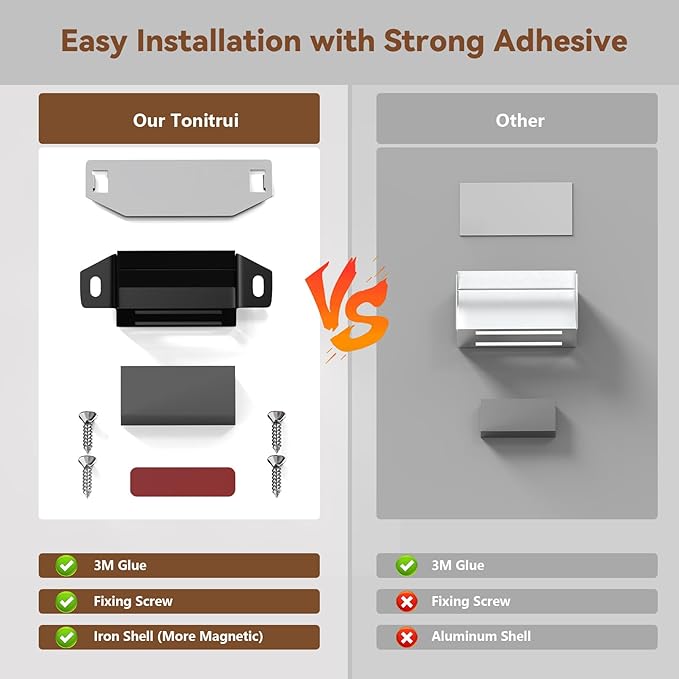 - Strong Adhesive and Easy to Install: cabinet magnet Come with powerful adhesive stickers, which can firmly secure our magnet, it can be easily installed without the use of screws and tools. Adhesive installation and Flat bottom can also be used on metal glass and marble surface doors without damaging your exquisite furniture.