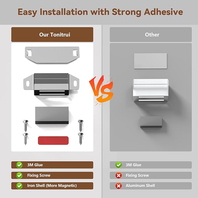 - Strong Adhesive and Easy to Install: cabinet magnet Come with powerful adhesive stickers, which can firmly secure our magnet, it can be easily installed without the use of screws and tools. Adhesive installation and Flat bottom can also be used on metal glass and marble surface doors without damaging your exquisite furniture.