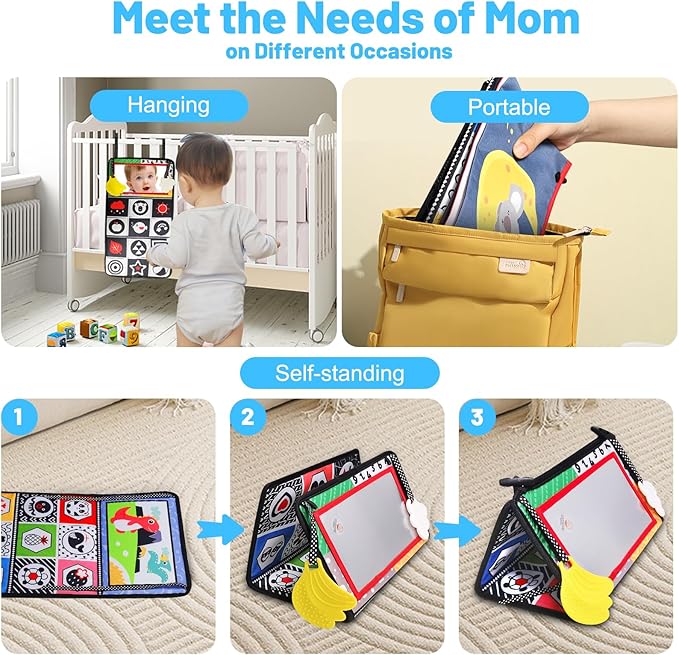 Baby Mirror Toys for Tummy Time, Newborn Infant 0 3 4 6 12 Months Old Boy, Girl Gift. Brain Developmental Montessori Sensory High Contrast Crinkle Book w Safe Mirror for Floor, Crib, Car, Bouncer