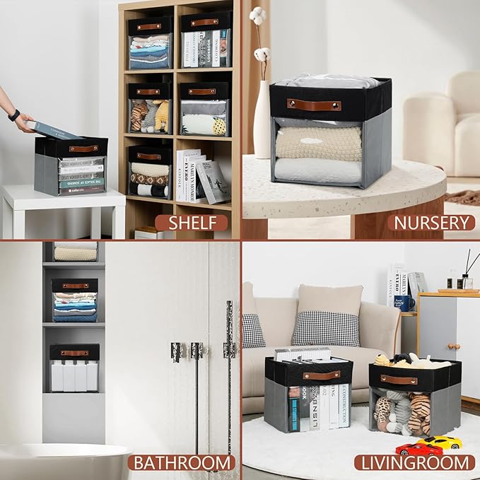 HNZIGE Cube Storage Bins 11 x 11, Fabric Cubes Storage Bins 11x11 Clear Storage Organizer,Canvas Storage Bin for Cube Storage, Cubby Collapsible Organizer Bin for Organizing Home(Gray Black 6PCS)