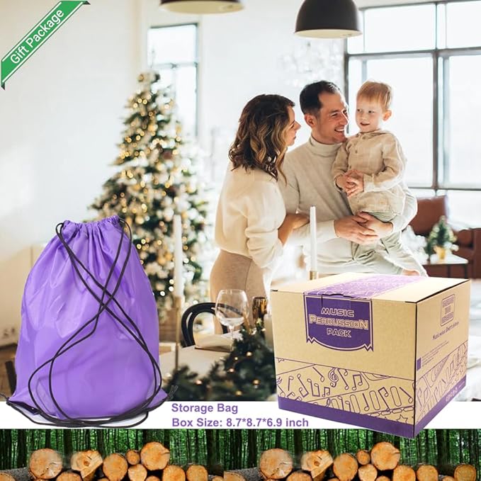 - 🎵.7 Types Percussion Set :1* Bongo Drum(Hand-held Drum). 1* Tambourine- 8 inch . 1* Big size Wood Tone Block and Guiro with Mallet. 1*Egg Shaker.1*Castanet with Thumb Handle. 1*Jingles Tap.2* Sleigh Bell. 1* Storage Bag. The sounds of all kinds of natural music stimulate children's interest in music.