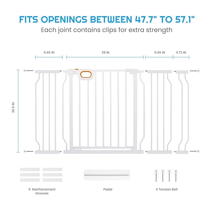 - 【Adjustable Width】This safety gates for stairs features a rectangular design, with 2 x 9.4'' and 1 x 4.7 '' extensions included in the packaging. The height of 30.5 inches and the adjustable width of 29-57.1 inches ensures that your baby or pet is away from danger.