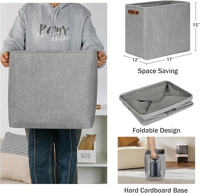 - 【Unique Design & Modern & Decorative】Set of 3 large storage baskets, dimensions(each): 17(L) x 12(W) x 15(H) inches. Collapsible storage baskets bring you organizing convenience and a sweet home. Great for socks, underwear, books, magazines, toys, baby clothes, pet products, wipes, towels, decorations, office supplies, DVDs, and gifts. The fabric baskets with neutral colors can match a lot of home styles - keeping your home nice and tidy.