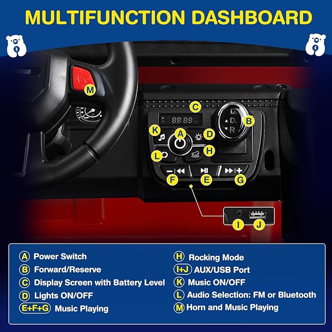 - ENDLESS FUN: Equipped with multiple music modes to choose from, including Bluetooth, USB, AUX, MP3, and FM, which will creat endless fun for your child's adventure. Features realistic engine startup sounds and lifelike driving operations, allowing children to embark on a thrilling riding experience.