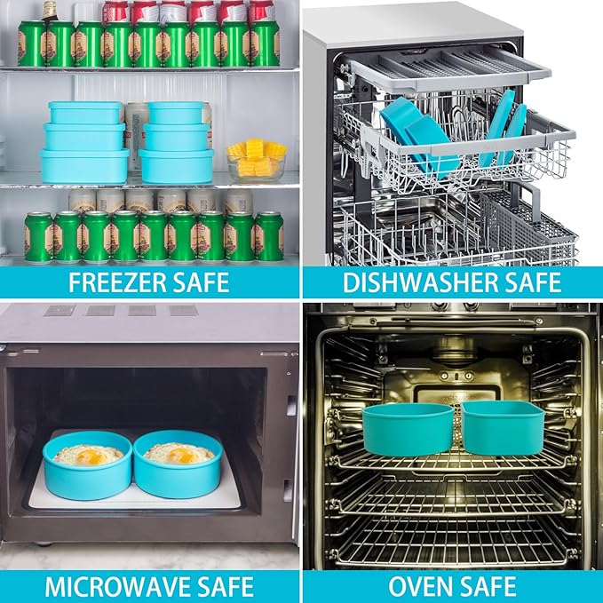 - 【AIR FRYER & MICROWAVE & FREEZER & OVEN & DISHWASHER SAFE】Temperature resistance of these silicone lunch box containers with Lids is -4℉~392℉ / -20℃~200℃. Microwave Freezer safe and even Air Fryer and Oven safe. Perfect for storing, reheating, freezing, and baking—ideal for leftovers, lunch, camping, snacks and bread. Dishwasher Safe. Just pop them in the dishwasher top layer when you are done for hassle-free cleaning.