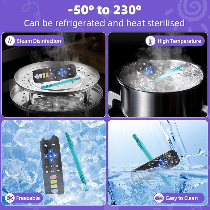- đ¶ăTEETHING TOYS for BABIES 0-6 6-12 MONTHS ăYou will get a black baby remote control toy , 3 different color hollow teething tubes, 1 tube brush and 1 keeper strap. Baby remote teether features bright color and realistic button design that looks like real TV remotes which improve color recognition & hand-eye coordination, learn early education. baby teething straws have 2 unique textured design for soothing sore gums, and gums with soft silicone bristles, which helps develop good oral hygiene.
