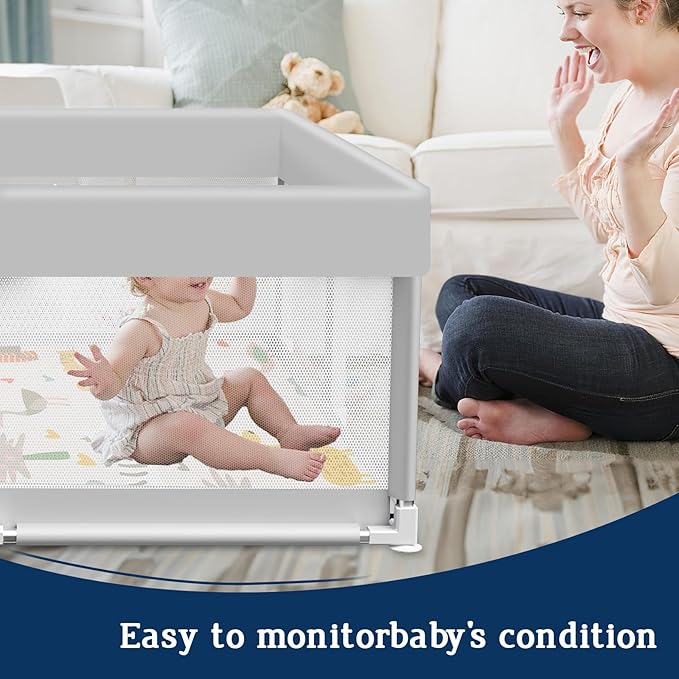 - Multiple Protection Design: Our baby fence has scientific standards,The fence is 27 inch high, Baby is not easy to climb out.Its bottom with anti slip suction cups,which are safe&stable.In addition, our fence links are covered with a thick fence fabric to cushion the damage caused by baby bumps.