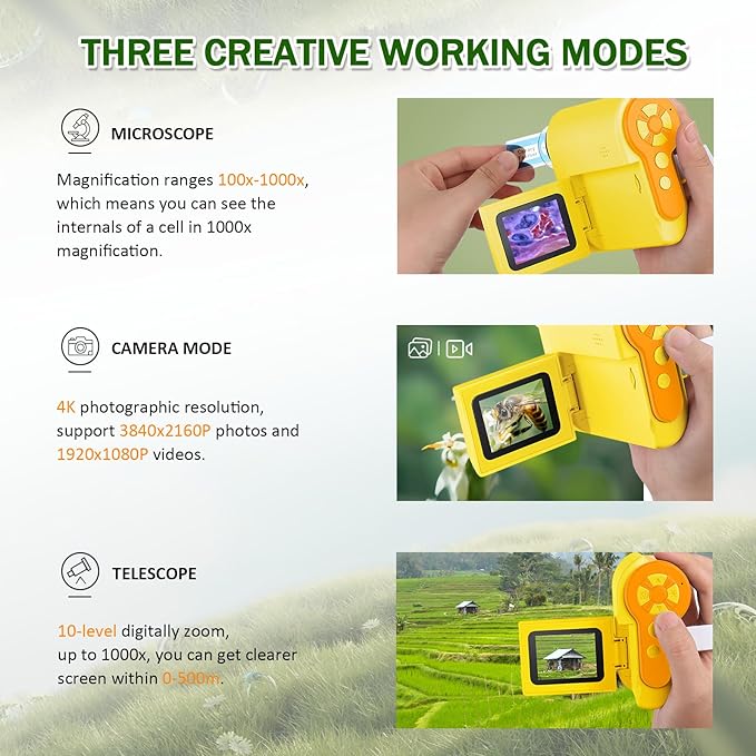 - ๐ฏ-๐๐ป-๐ญ ๐๐ฒ๐๐ถ๐ด๐ป: 1) Microscope Searching, 2) One-Click Photo & Video Recording, 3) Telescope, choose what you want to enhance child's learning experience. And this digital microscope made of 4K resolution, provides much higher clarity