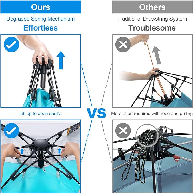 - Easy Setup & Super Stable: The specially designed spring opening system shows an industry-leading level of improvement. One person can set up the beach tent easily in seconds. Compared to the drawstring design, this one is faster, effortless, and saves more time. The 8.5 mm thick fiberglass poles make the tent stronger. Equipped with 3 sandbags, 4 wind ropes and 10 stakes to ensure stability and prevent it from being blown away in the wind.