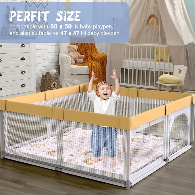 - 【Versatile Use】Baby play mats measure 50”x 50”and fit perfectly with popular brands like LIAMST, TODALE, YOBEST, Fanbufan and EIH 50 x 50 baby playpens. Or use baby playmat as area rug, baby crawling mat, kids tent mat, travel play mat, making them great for indoor and outdoor use.