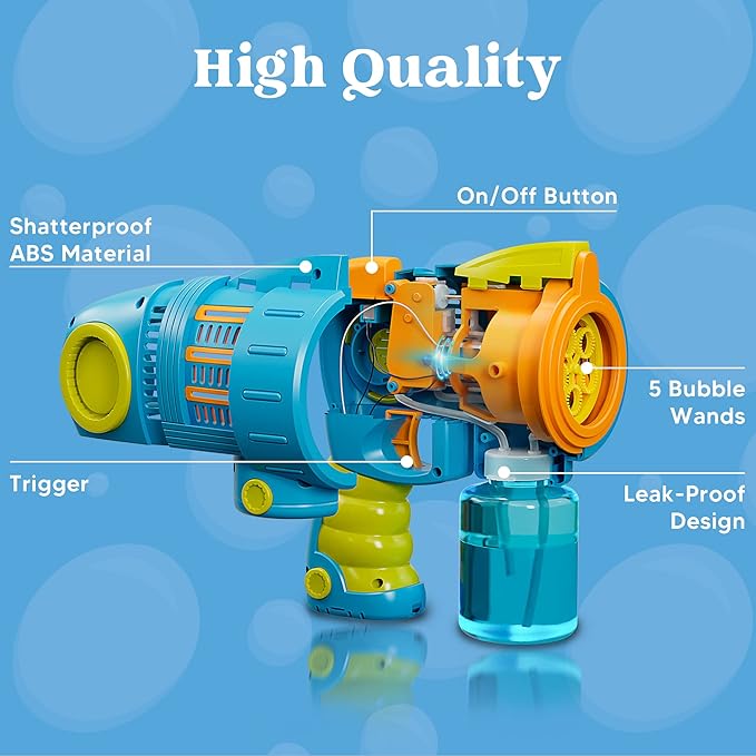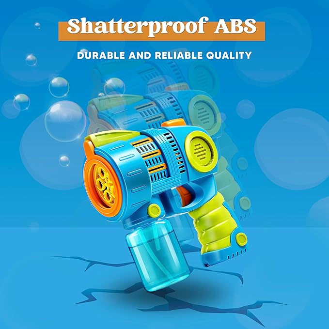 - SHATTERPROOF MATERIAL, LEAK-PROOF DESIGN. This premium quality automatic bubble gun is made out of ABS sturdy and shatter-resistant. The leak-proof silicone sealing ring perfectly fits the bubble gun and bottle. This Bubble Gun Machine proof leak bubble solution no matter how shaken.