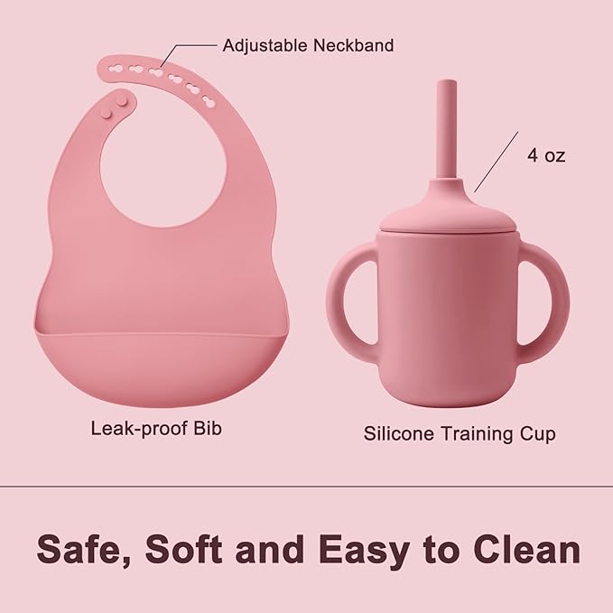 - Baby Led Weaning Supplies: Our silicone bib is designed with a deeper and sturdier pocket, making it highly effective in catching dropped food and easy to clean. The adjustable circular design is particularly gentle on your baby's skin. Our training cup is expertly crafted to fit snugly in your baby's small hands and mouth, safeguarding their developing teeth. Furthermore, the straw is equipped with a spill-proof function, aiding babies in transitioning from breastfeeding and promoting independent drinking.