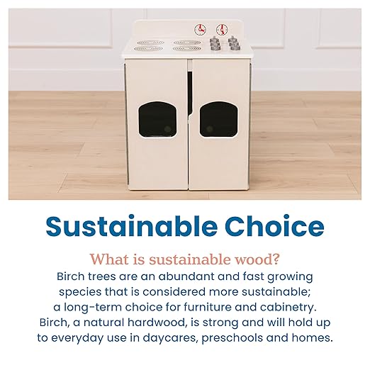 - Certified Safe: Institutional quality wooden play kitchen is GREENGUARD [GOLD] Certified for low VOCs, TSCA and CPSIA compliant; cut-out handles allow adults to pick up and transport
