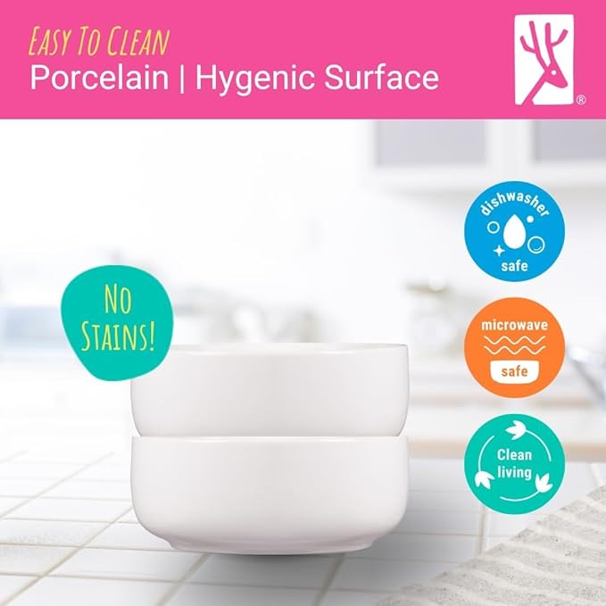 - INNOVATIVE: Our porcelain kids bowls are designed so kids can eat from safe non-absorbent materials. Unlike plastic, silicone or bamboo, porcelain has a non-porous surface ensuring a pure taste as no food/germs/soaps are absorbed. With the non-porous surface, say goodbye to stubborn stains. Porcelain is easy to clean, eliminating chemicals, grease and colored stains effortlessly.