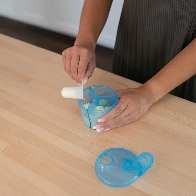- PORTABLE FORMULA CONTAINER. Compact and travel-friendly making it easy to bring pre-measured servings of formula wherever you and baby go. Leave bulky formula containers at home!