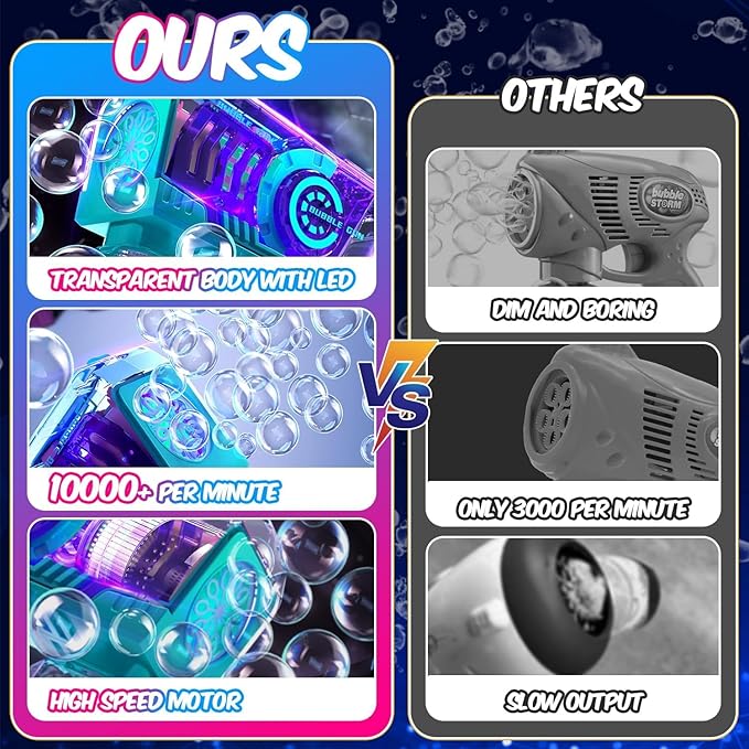 - ✅【High Output Bubble Maker】Our bubble blower features a high-speed motor and 10 holes outlet, allowing it to produce over 10,000+bubbles per minute. Whether it's day or night, this bubble guns will create amazing effects and provide hours of entertainment for kids.