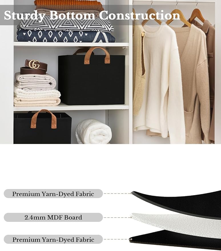 - Premium Quality: Made from high-quality fabric and reinforced with a heavy-duty MDF bottom board and a sturdy metal frame. The solid construction enables the storage bins to stand upright without support, even when empty.